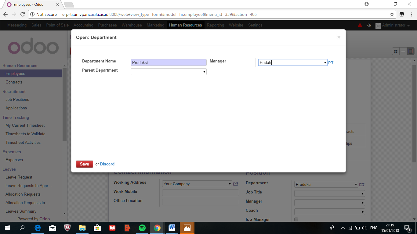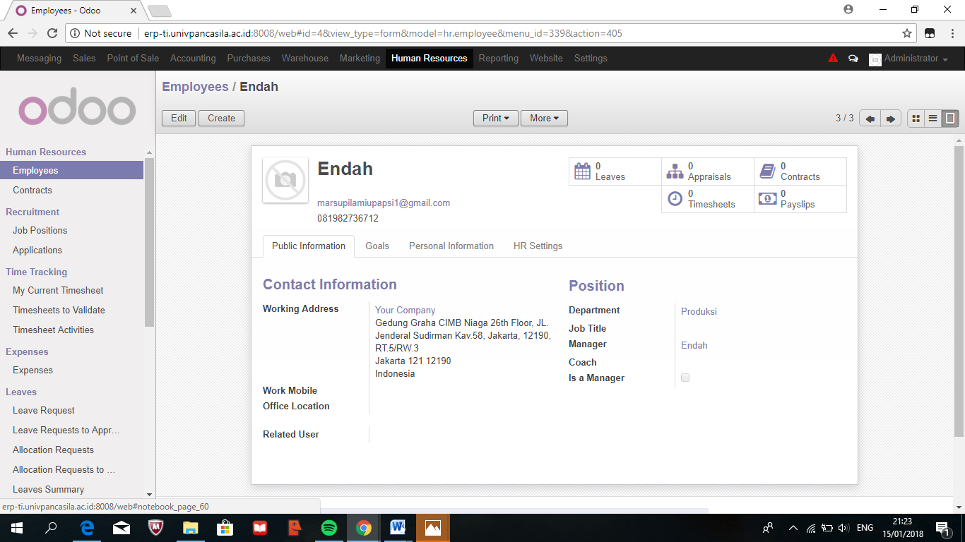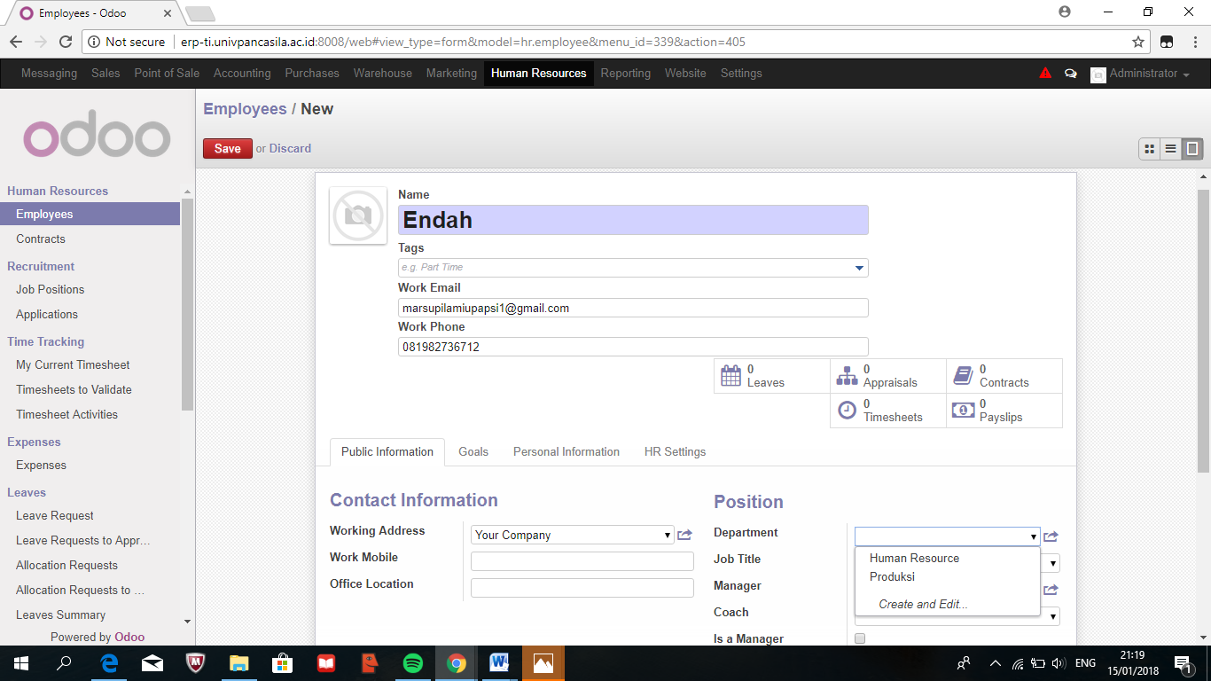 HRD atau dalam bahasa Indonesia disebut sebagai bidang sumber daya manusia, adalah bagian atau divisi dalam suatu manajemen perusahaan yang bertugas untuk mengatur serta mengembangkan sumber daya atau kemampuan seluruh pekerja yang ada dalam suatu perusahaan. Salah satu tugas HRD adalah bertanggung jawab penuh dalam proses rekrutmen atau pencarian tenaga kerja, mulai dari mencari kandidat terbaik, melakukan sesi wawancara atau interview, sampai proses penyeleksian. Di Perusahaan yang telah saya wawancarai yakni CV. Arya Duta yang bergerak dalam bidang percetakan dan penerbitan, telah memiliki karyawan sekitar 500 orang yaitu pekerja tetap khusus penerbitan dan percetakan sekitar lebih dari 330 orang dan karyawan harian atau disebut freelance sekitar lebih dari 100 orang. Karyawan yang dimiliki tentu harus melalui proses penyeleksian sesuai syarat yang telah ditentukan oleh perusahaan agar karyawan yang dipilih cocok dan sesuai dengan kebutuhan perusahaan. Setelah karyawan terpilih maka data karyawan tersebut perlu dimasukan kedata perusahaan. Disini saya akan menjelaskan cara memasukkan data karyawan baru menggunakan Odoo. Langkah-langkahnya sebagai berikut :