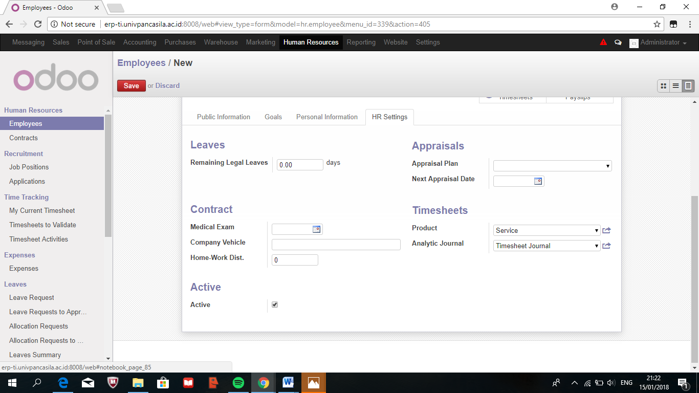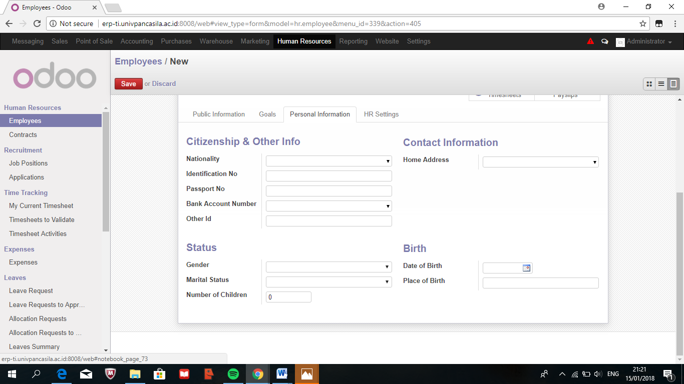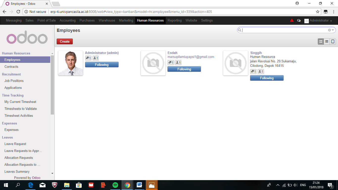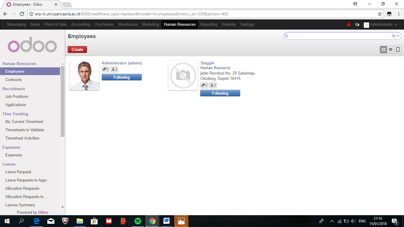 HRD atau dalam bahasa Indonesia disebut sebagai bidang sumber daya manusia, adalah bagian atau divisi dalam suatu manajemen perusahaan yang bertugas untuk mengatur serta mengembangkan sumber daya atau kemampuan seluruh pekerja yang ada dalam suatu perusahaan. Salah satu tugas HRD adalah bertanggung jawab penuh dalam proses rekrutmen atau pencarian tenaga kerja, mulai dari mencari kandidat terbaik, melakukan sesi wawancara atau interview, sampai proses penyeleksian. Di Perusahaan yang telah saya wawancarai yakni CV. Arya Duta yang bergerak dalam bidang percetakan dan penerbitan, telah memiliki karyawan sekitar 500 orang yaitu pekerja tetap khusus penerbitan dan percetakan sekitar lebih dari 330 orang dan karyawan harian atau disebut freelance sekitar lebih dari 100 orang. Karyawan yang dimiliki tentu harus melalui proses penyeleksian sesuai syarat yang telah ditentukan oleh perusahaan agar karyawan yang dipilih cocok dan sesuai dengan kebutuhan perusahaan. Setelah karyawan terpilih maka data karyawan tersebut perlu dimasukan kedata perusahaan. Disini saya akan menjelaskan cara memasukkan data karyawan baru menggunakan Odoo. Langkah-langkahnya sebagai berikut :